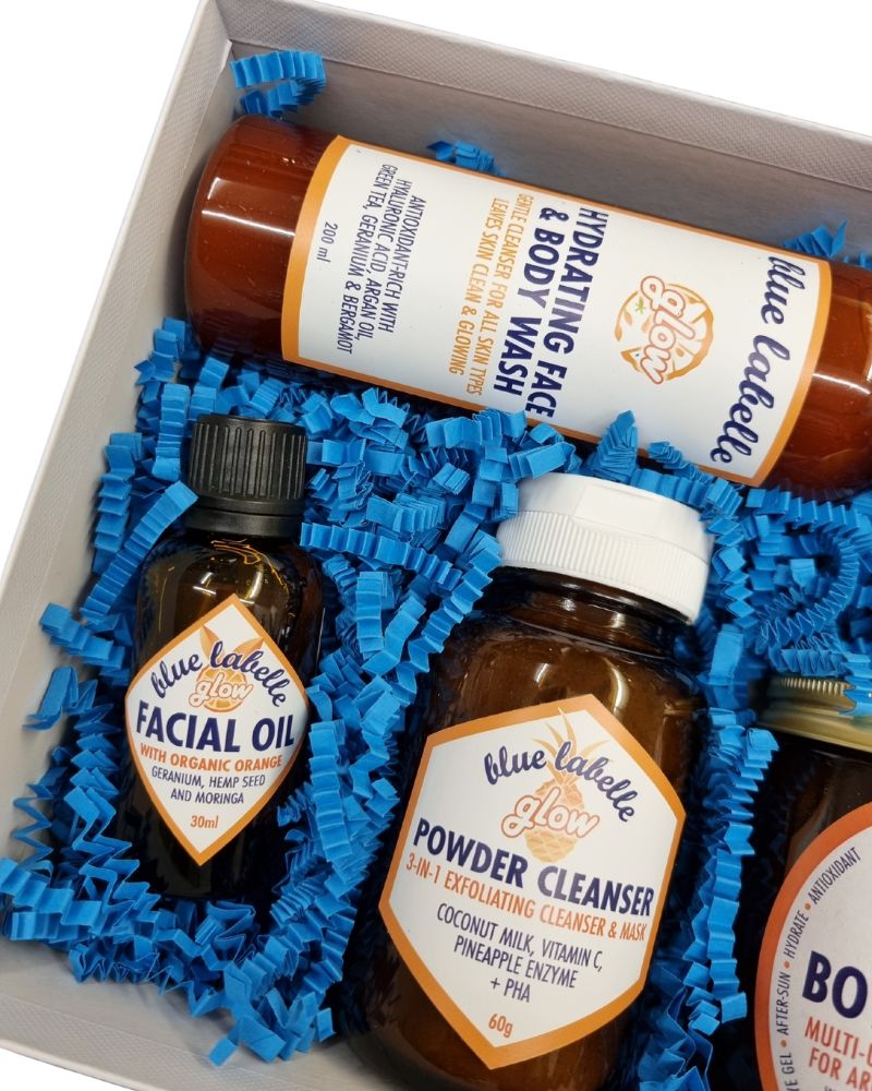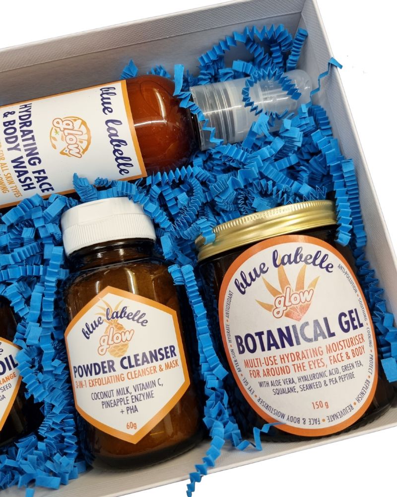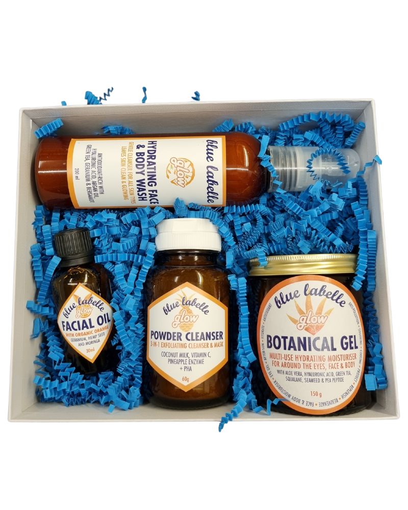 Housed in a gift box this set contains a Glow Hydrating Face & Body Wash (200ml), Glow Powder Cleanser (60g), Glow Botanical Gel (150g) and Glow Facial Oil (30ml). Your skin will be clean, exfoliated, hydrated and nourished, in other words it’s the ideal facial kit for glowing skin.